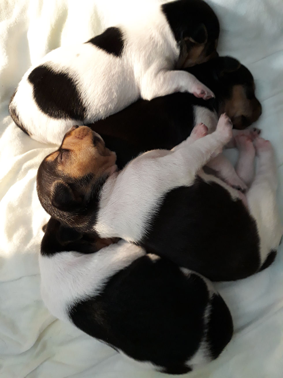 Valpene har hatt en god vekstkurve og alle har mer enn doblet vekten sin etter den første leveuka😍 På den 9.ende dagen begynte øynene til den ene tispa å åpne seg, så nå er det ikke lenge før de kan både se og høre.